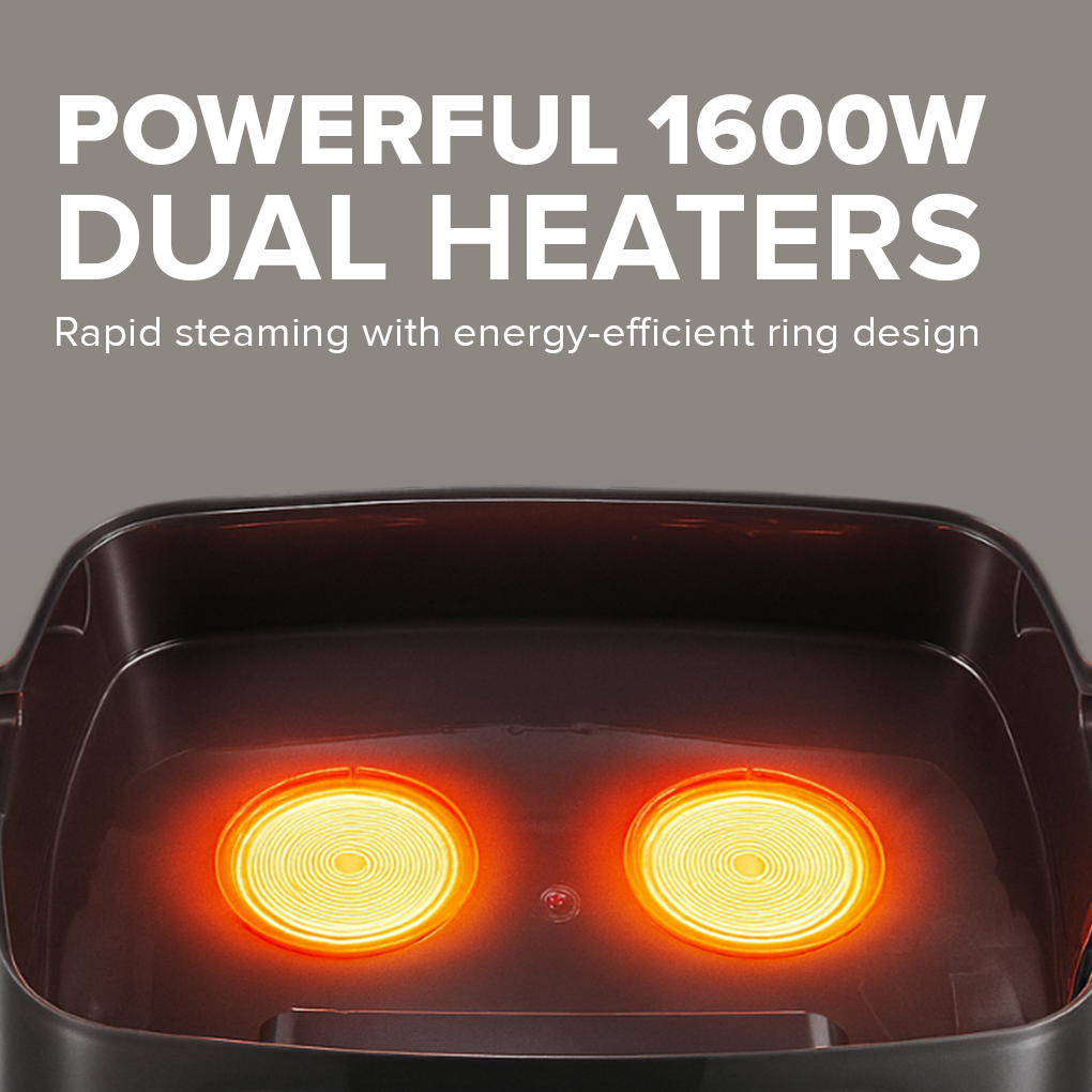 Equipped with a 1600W powerful dual heating system and energy-efficient frame ring design, it ensures rapid steaming and even heat distribution. The durable stainless steel heating element guarantees long-lasting performance, while the 60-minute timer with stay-on function provides convenient and flexible cooking control.