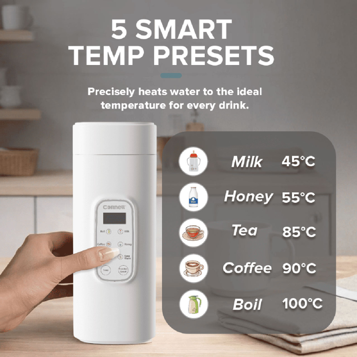 Boil water safely and conveniently wherever you go with the Cornell Portable Kettle 550ml. Designed for travel, office use, dorms, and compact living spaces, this kettle features 5 preset temperature controls, a patented leak-proof design, and a cool-touch double wall for safe daily use.