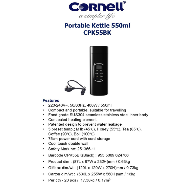 CORNELL PORTABLE KETTLE 550ML CPK55BK & CPK55WH