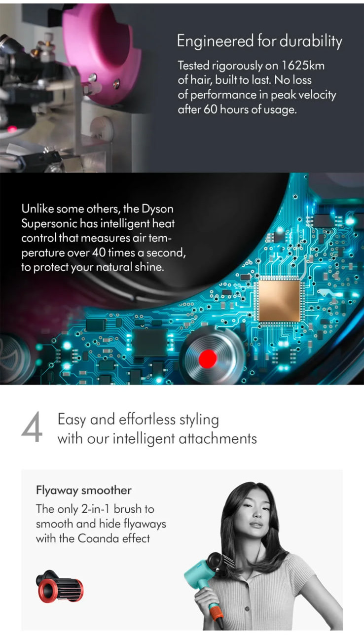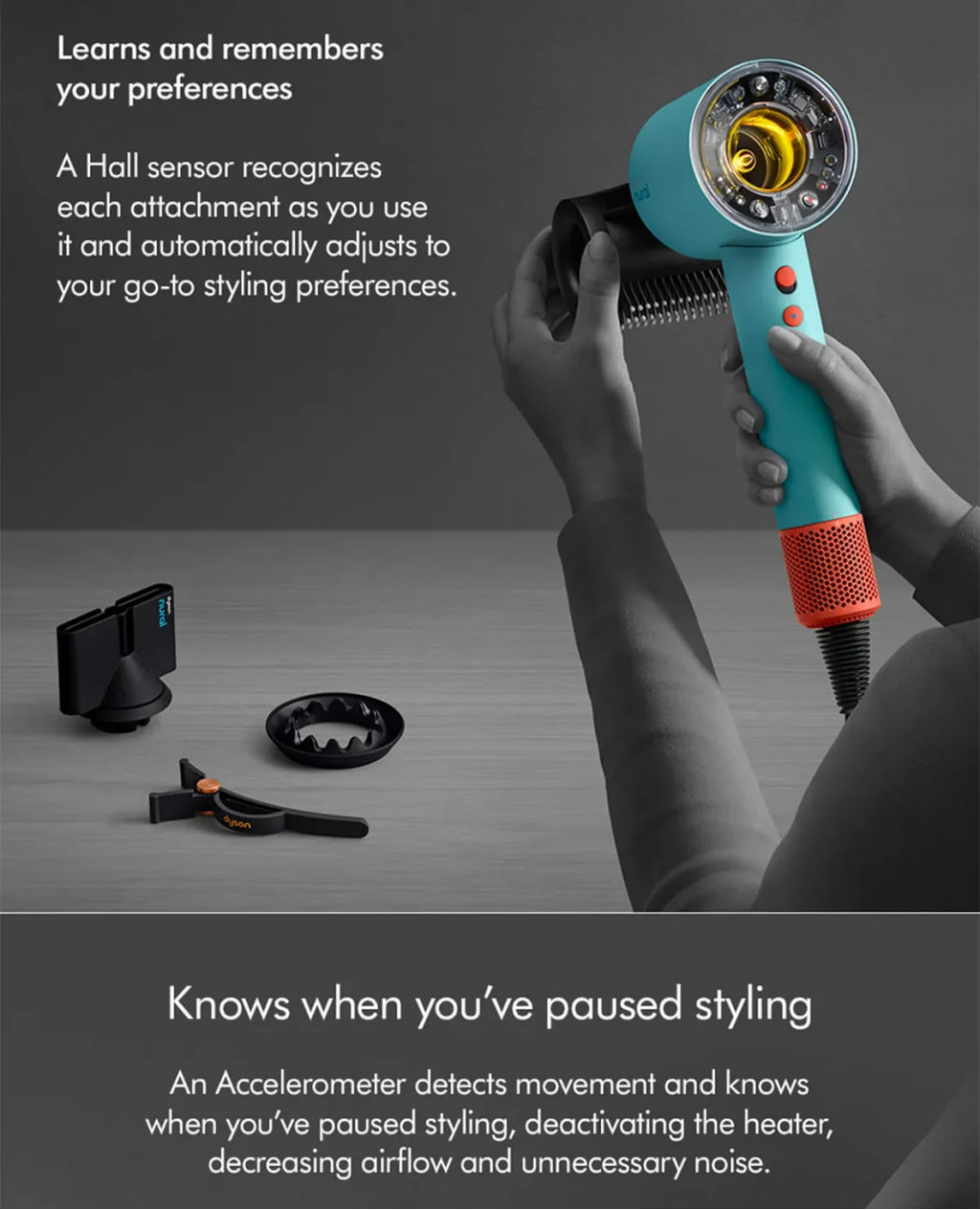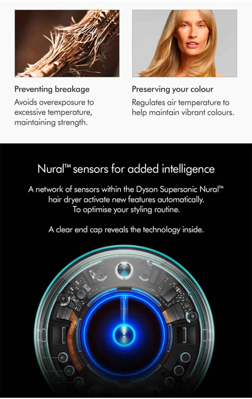 A network of Nural sensors automatically adjusts airflow and temperature to enhance shine and help protect scalp health.¹
