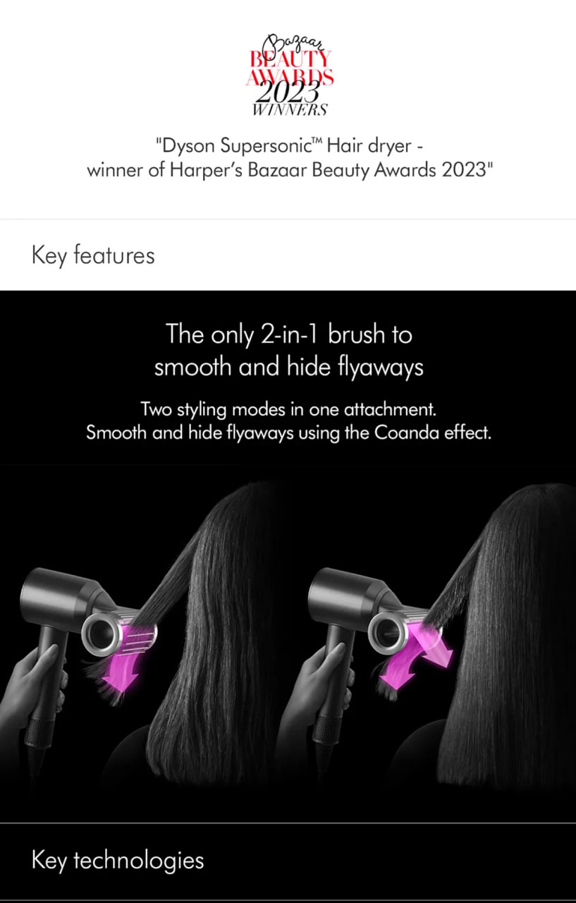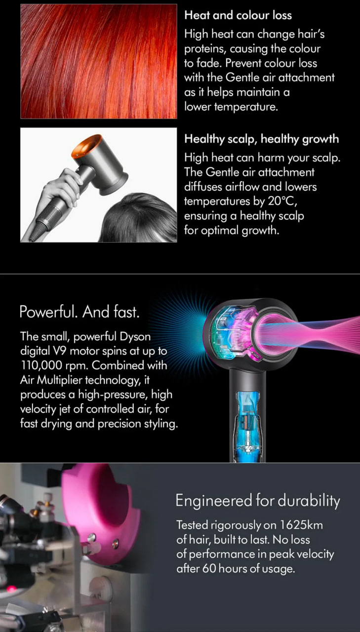 - With Air Multiplier™ technology to produce a high-pressure jet of controlled air, for fast drying and precision styling.