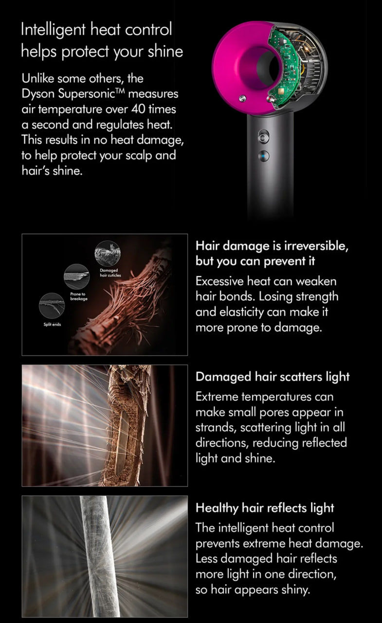 - Fast drying. With no heat damage. Intelligent heat control helps protect your hair's natural shine.