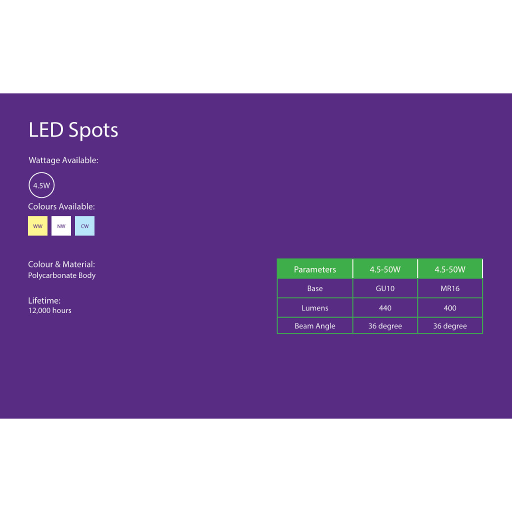 LED SPOTS series spotlights are specifically designed to enhance the aesthetics of your spaces with a focused beam of light. The long-life LED light source has a strong, focused beam, making it an essential addition to your home. Applicable for bedrooms, living rooms, and indoors.
