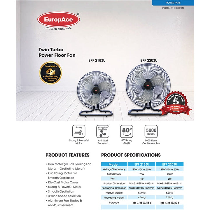 EuropAce 18"/ 20" Twin Turbo Power Floor Fan EPF 2183U/ EPF 2203U