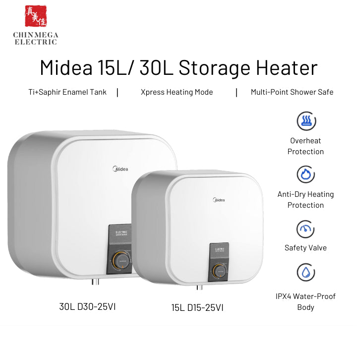 Midea 15L/ 30L Electric White Storage Heater (D15-25VI/ D30-25VI) // 1 Year Local Warranty