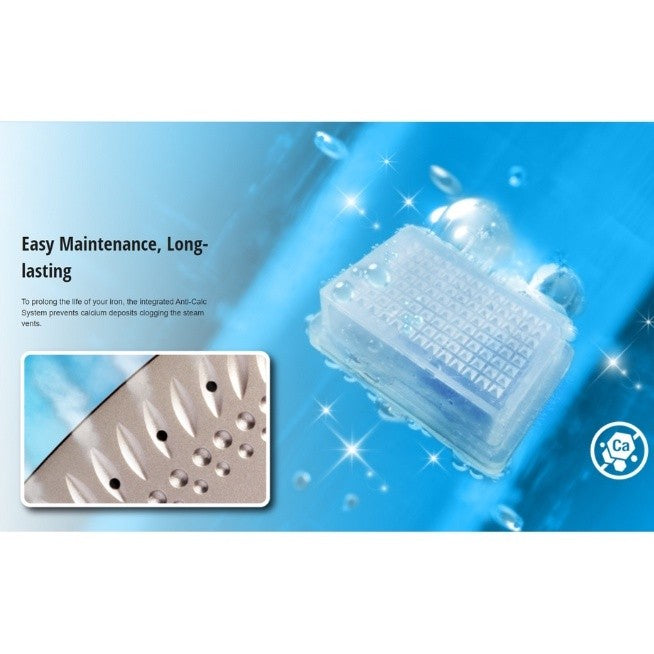 To prolong the life of your iron, the Integrated Anti-Calc System prevents calcium deposits clogging the steam vents.