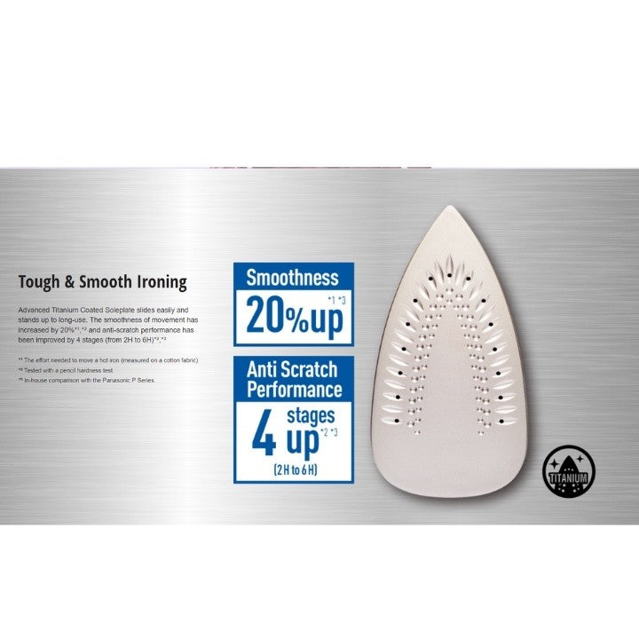 Advanced Titanium Coated Soleplate slides easily and stands up to long-use. The smoothness of movement has increased by 20%, and anti-scratch performance has been improved by 4 stages.