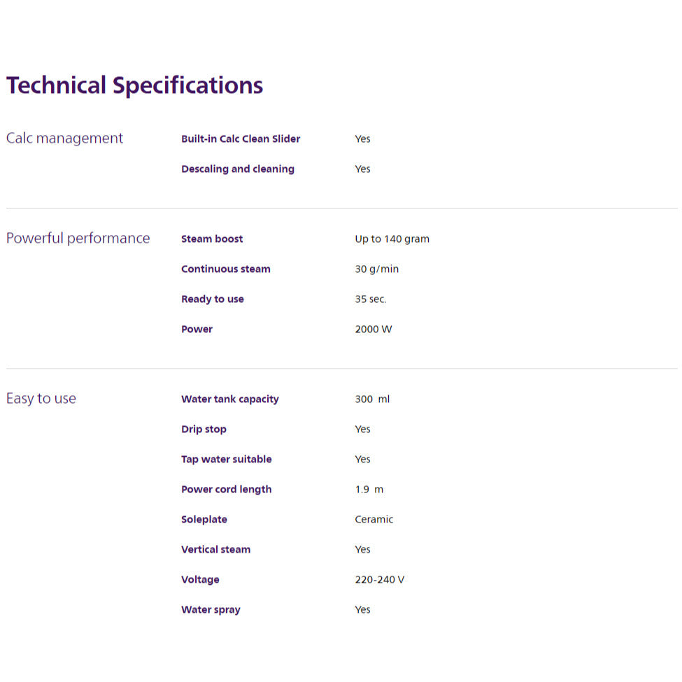 Philips DST3010/30 Steam Iron. DST3010 3000 Series. 2000W Power. 140g Steam Boost. Safety Mark Approved. 2 Year Warranty