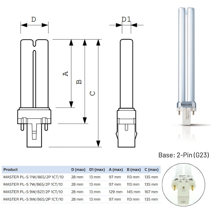 Philips Master PLS (7W / 9W / 11W) 2 Pin G23 Base // 827 Warm White, 865 Cool Daylight